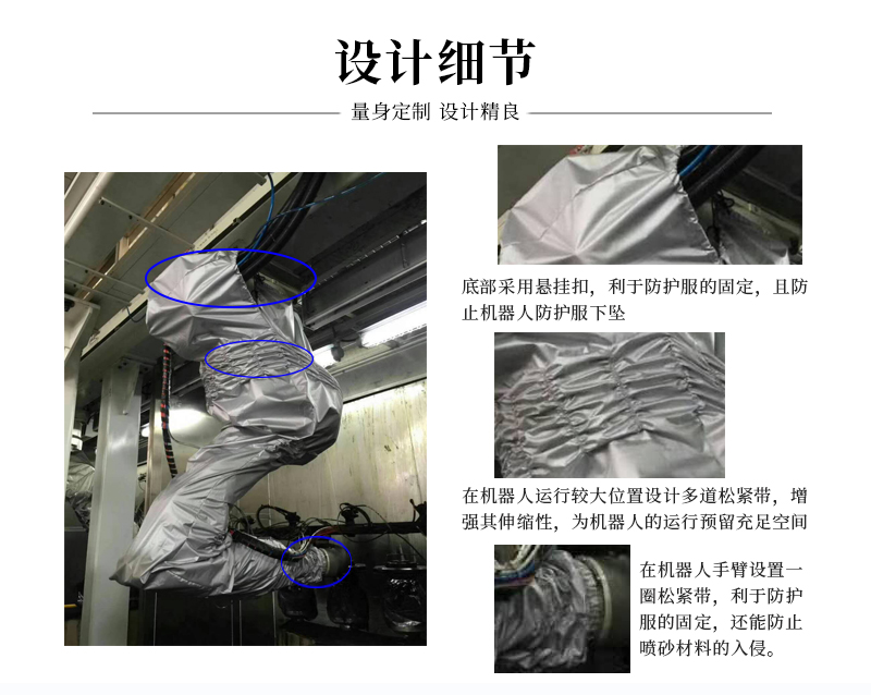 噴砂機(jī)器人通常會產(chǎn)生極高濃度的粉塵,同時還伴隨高沖擊力的固體高溫飛濺物,可能對機(jī)器人的機(jī)體,特別是供電線路造成損壞。對此,昂拓研發(fā)出耐磨、耐高溫,隔熱,耐污,保護(hù)機(jī)器人及線路的噴砂機(jī)器人防護(hù)服,全方位地對機(jī)器人進(jìn)行防護(hù)。