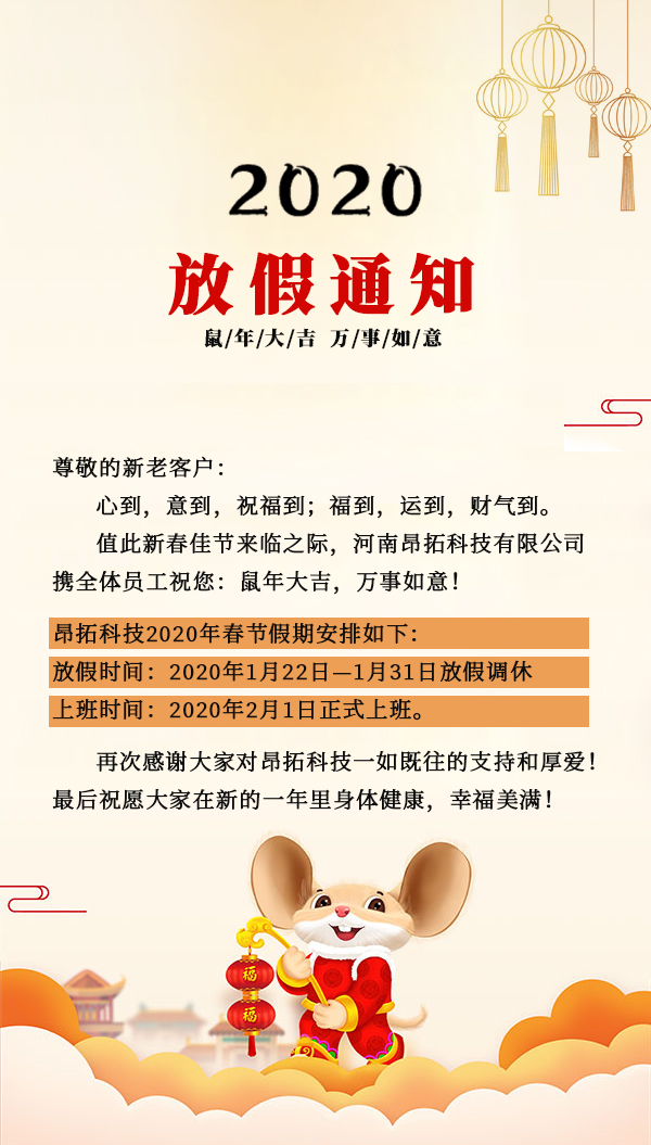 當(dāng)前位置:主頁 > 新聞中心 > 公司動態(tài) > 昂拓科技2020年春節(jié)假期安排