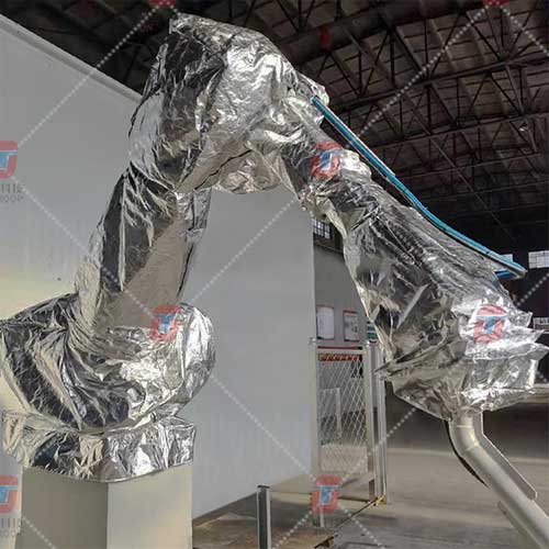 鍛壓機器人防護服的功能并不止于此。昂拓機器人防護服屬于定制產(chǎn)品,根據(jù)現(xiàn)場工況和需機器人防護服還具備防熱輻射和防高溫飛濺等功能。這是因為在高溫環(huán)境中,熱輻射和飛濺是對機器人本體和附件管線的一大威脅。因此,鍛壓機器人防護服的有效防熱輻射和飛濺功能對機器人的保護也很重要。